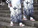 ちょうどあやめおどりを終えた婦人会の皆さんが引き上げていくところでした。ゆかたに描かれたあやめ(ハナショウブ)の絵が印象的です。前川あやめ園のハナショウブにはさまざまな種類があるようです。同じ紫色のハナショウブでも、ここのハナショウブの花は黄色が混じり、紫の色合いも異なります。花びらには毛細のような濃紫色の線が入っています。