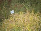 ほぼ予定時刻どおりに集合場所の宍塚小学校に着きました。ただ、どこへ車を停めたらよいやらわからず、宍塚の集落をついつい一周してしまいました。小学校には皆さん、既に集まっていました。皆さんと一緒に里山ウォーキングに出かけました。校門を出ると、道向かいにビオトープがありました。「でっか池」と名付けてありました。稲も育てていますね。周囲にはガマの穂も。図鑑で調べてみると、ガマはガマでもコガマのように見えます。ソーセージのような部分の長さはコガマは10cm以下、ふつうのガマは10〜20cmです。色などもコガマのように見えます。ちょっとよくわかりませんね。