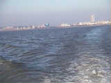 沖宿の沖を過ぎてかすみがうら市加茂の沖合を通過しています。後方には筑波山が姿をくっきりと見せています。実に素晴らしい! 視界を遮ることなく、山地全体が屏風絵のように展開しています。霞ヶ浦から筑波山を見て感動する心。地域的なアイデンティティを育んでくれますね。沖宿を過ぎた、ちょうどこの地点は、沖宿に突き出た新治台地が湖に突き出たような感じの見え方になり、その背後に筑波山が重なって見えます。この構図、これまでにも何度も船上から眺めて、かなり私の心にも美しい風景として擦り込まれてきました。この辺まで進んでくると、阿見町側の湖岸線は順光気味になって、さきほどよりは少しはっきりと捉えられるようになってきました。予科練、といってはいけないですね。陸上自衛隊武器学校がよく見えます。掛馬沖の水質自動監視所(かまぼこの形状)も見えますね。