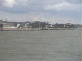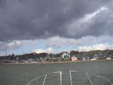 横利根川から北利根川(常陸利根川)へ出ると、船が波で揺れました。がいあ船長によると、北利根川でこんなに波立つのは珍しいという話でした。たしかに以前、ジェットホイールつくばで土浦から潮来に来た時も北利根川は穏やかでも、霞ヶ浦は風びゅうびゅうの時化気味の状態でした。霞ヶ浦が穏やかな日の方がむしろ少ないのでしょうか。暗雲まで立ちこめています。この日の予報は昼は時化るということで、予報どおりの状況となったようです。船長も行き先をちょっと迷い、新横利根閘門の前を旋回して潮来港へ行くことに決めました。