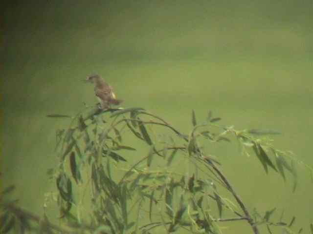 小高干拓(行方市橋門)でサギを望遠撮影していたら、ファインダーにたまたまこの鳥が入ってきました。明らかにスズメではありません。望遠撮影でもこの程度にしか捉えられなかったので判然としませんが、おそらくセッカではないかと思います。淡い茶色の羽根、喉元から体下面にかけての白色などの特徴から、最初はオオヨシキリではないかと思いましたが、少し小ぶりなのと、オオヨシキリは頭の羽根が逆立って帽子を被っているように見えることが多いことから、セッカではないだろうかと推察しました。背中の羽色や模様が微妙にオオセッカとも違うように思います。いずれにしても、映像に捉えられた鳥の姿が小さすぎてよくわかりません。