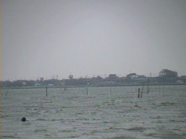 潮来市永山の霞ヶ浦湖岸(西浦左岸1.00km地点)から捉えた霞ヶ浦対岸の景観です。北方向の天王崎付近の湖岸が突き出ている様子がよくわかります。この地点から捉えられる霞ヶ浦の対岸は、稲敷市(旧東町)本新〜稲敷市(旧桜川村)浮島にかけての湖岸線になりますが、視界も悪い上、平坦すぎて場所の特徴はよくとらえることはできませんでした。沖合いの湖上には無数の杭が見えています。