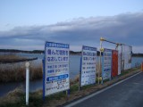 霞ヶ浦の湖岸道路を進むつもりでしたが、八木干拓の入口で、ご覧のとおり井関地区護岸工事の説明板が立っており、道路は通行止めになっていました。