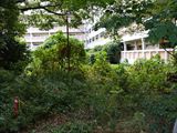 途中、大通りを車道をまたぶ立体交差の歩道を通過しました。この橋は昭和53年(1978年)3月竣功の吾妻南橋と記されています。今年2025年から遡ること47年前の竣工。筑波研究学園都市建設間もない頃に建設された公務員宿舎が今も残っています。一部の建物は廃屋になっています。この辺り、研究学園都市が既に半世紀近い歴史を刻んでいることがわかります。