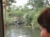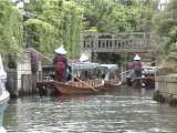 十二橋の風景が見事ですね。この辺の風景が十二橋めぐりの一番美しい辺りではないでしょうか。十二橋の木橋、河岸の屋敷に巡らされた生け垣、水路を竿で操る舟と船頭さんが一つになって、十二橋の美しい風景を作り出しています。水路(新左衛門川)の岸壁は低いところは概ね高さ50cm程度でしょうか。先ほど船頭さんから加藤洲閘門では常陸利根川と利根川の水位差50cmが調整されると話を聞いたばかりでしたが、この岸壁を見るとこの水位差よりも高くすることが必要であったことが想像されます。それぞれの屋敷の庭先はこれよりもさらに高く、水面からは1m以上はあるように見えます。水害から守るために地面を高くしてこの高さになったのでしょう。それでも洪水の時などは水に浸かることがあったのでしょう。