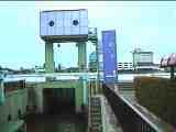 片側の閘門から閘室に入った舟の船頭さんは、閘室内の通行ボタンを押して、出口の閘門が開くのを閘室内で待ちます。この間に、水路側と閘室内の水位が調整されます。