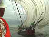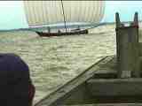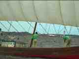 帆曳き船の帆が帆柱の一番上まで揚げられました。帆の下が上がって、船上が見通せるように変わりました。これが、帆曳き本来の帆の揚げ方のようです。