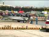 車に曳かれたモーターボートが次々に湖に進水していきました。港湾内のスロープで、このように車からボートを切り離してボートに乗り移るんですね。