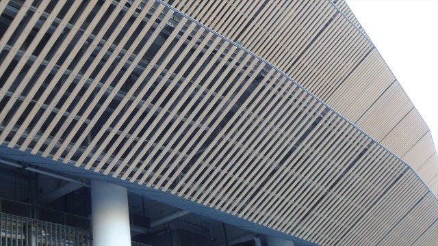 初めて訪れる新国立競技場をマジマジと見まわしながら指定席に近い最寄りのゲートに向かいました。確かに目につくのは庇に使われている木材です。が、壁と柱の白塗りが支配的で、全体の印象としては白塗りの印象が強くなります。