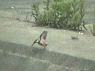 」)。1回目、2回目とも、目撃した場所は護岸堤近くの用水路でした。用水路縁に前かがみに佇むカワセミの姿のかわいらしかったこと。カワセミはこんなに小さな鳥だったのですね。20倍の望遠で撮影していましたが、映像に記録された大きさは御覧のとおり小さなものでした。車のガラス越しだったので、鮮明な画像ではありません。しばらく佇んだ後、突然、用水路に飛び降り、獲物をくわえて飛び去っていってしまいました。獲物を取る瞬間を撮り損なったのが惜しまれます。