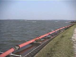 国立環境研究所が面する大山の湖岸から大山沖を展望しました。湖岸線沿いに霞ヶ浦大規模浚渫の送泥管が這っています。ここから3kmほど北西方向に位置する美浦村牛込の湖岸から霞ヶ浦を展望した時には真正面の対岸に出島の湖岸線から筑波山までが迫って見えていました(→「