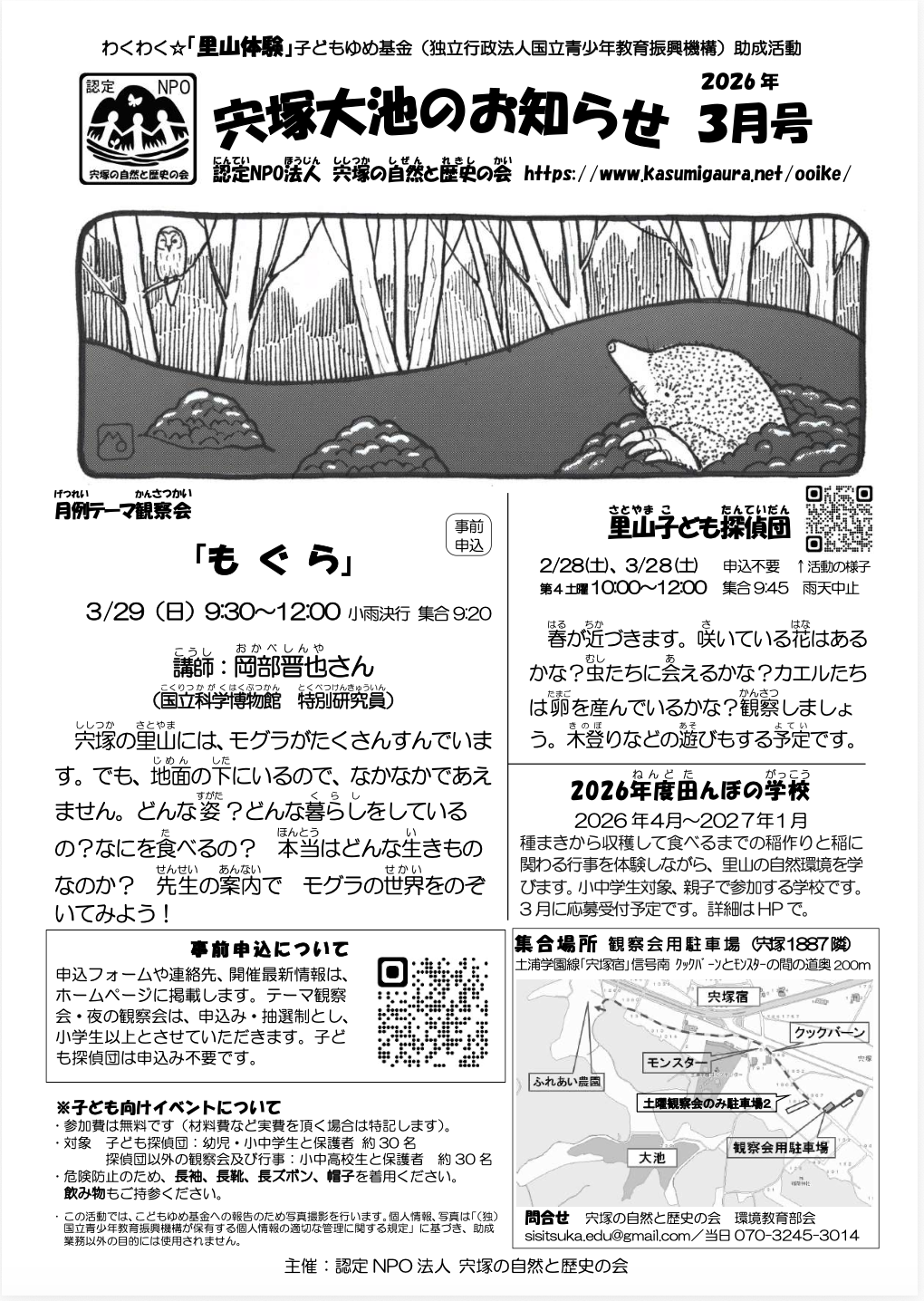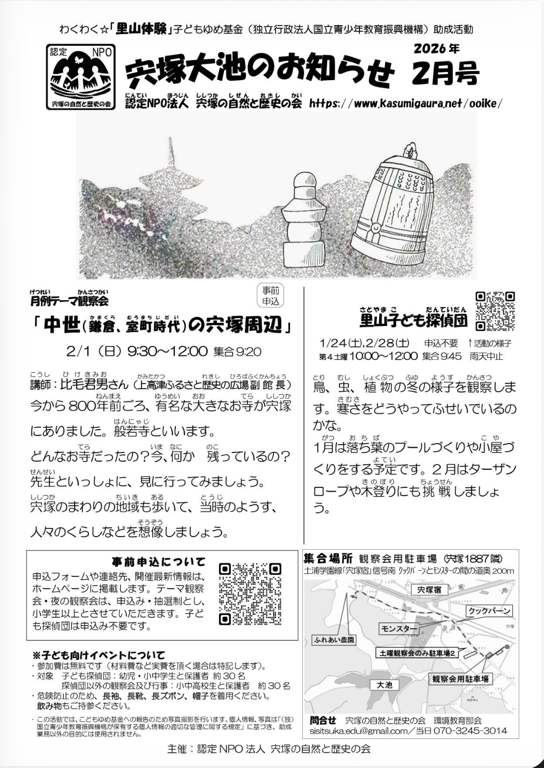●月例テーマ観察会の行事の詳細と申込み、開催状況はテーマ観察会ブログをご覧ください。 宍塚大池のお知らせ2026年2月 宍塚大池のお知らせ2026年3月
