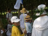 早速、林に入った子供たち。眼光鋭くカブトムシを探す。「あっ、見つけた。」手を伸ばしてカブトムシ(メス)をゲット。