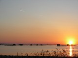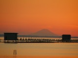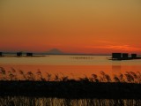 歩崎側から霞ヶ浦大橋を渡り行方市手賀(玉造)まで約20分、手賀湖岸についた。今日もがっかり・・富士山の姿は見えなかった。待つことしばしpm16:42分落日の霞ヶ浦の地平線に富士山があらわれはじめた。・・・・