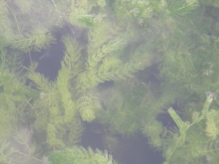 私は苦しい・霞ヶ浦のマツモ群落Aug/2007 前年も紹介させて頂いた霞ヶ浦、かすみがうら市の沈水植物、マツモ群落が今年梅雨明けの8月始めに観察したところ呼吸不全で、例年より葉緑素が少なくなにか元気がない様子でした。昨年〜今年の春にかけては群落が減少していましたが今夏になってマツモ群落の水中密度が高くなってきました。元気がない理由として次のような理由が考えられます。@比較的高温ながら、7月の日照が少なかったこと。A群落密度が高くなり、水温が高い中、水の循環がわるくなって日中と夜間の呼吸が正常に行えない。8月の日照が多くなるとマツモの生育が改善されると思いますが現在までに発生した緑藻が部分的にマツモにからみついているのが気になる。 数ミリのタナゴやモツゴ、鮒など、おおくのさかながマツモの群落の中を泳いでいます。